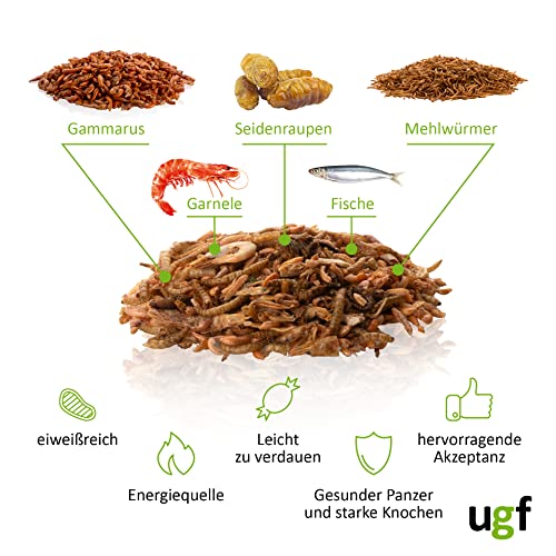 Mix di Cibo Universale per Tartarughe UGF, Secchio da 500 Millilitri, Cibo Bilanciato per Tartarughe, Gammarus, Bachi da Seta, Vermi della Farina, Gamberetti e Pesce Essiccato, Cibo per Tartarughe