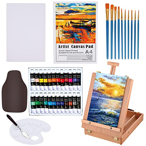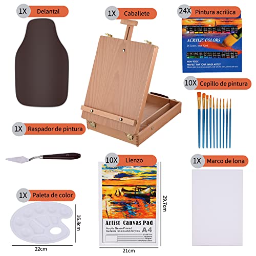 Cieex Cavalletto da Tavolo con 24 Colori Tubi di Colori Acrilici, 10 Pennelli, Spatola, Grembiuli, Tavolozza Colori e 10 Tela A4 per Pittura per Professionisti e Hobbisti
