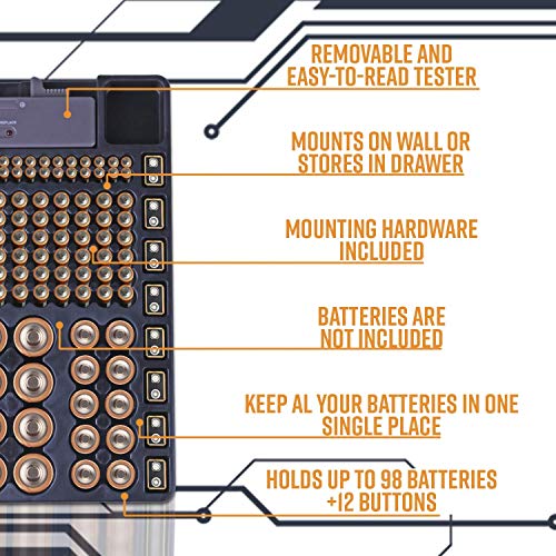 TESTER IMPRESSIONANTE E RACK DELLA BATTERIA! Questo bellissimo porta batterie per batterie assortite trasforma il tuo casino di un portabatterie in una perfetta organizzazione.Rende facile vedere quanti ne hai di ogni tipo e di cosa potresti aver bisogno. Si inserisce bene in un cassetto e montato a parete.Il nostro prodotto ha fori per montaggio a parete e l'imballaggio include l'hardware di montaggio che insiste su 3 ancoraggi in plastica e 3 viti.