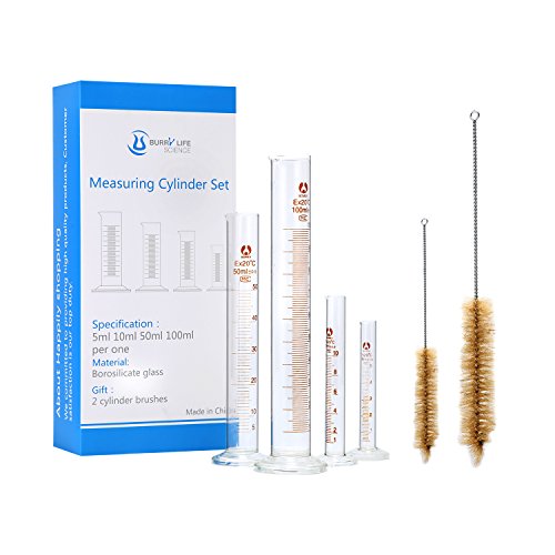 Set da 4 cilindri graduati di misurazione da 5 ml, 10 ml, 50 ml, 100 ml, in vetro, con due spazzole
