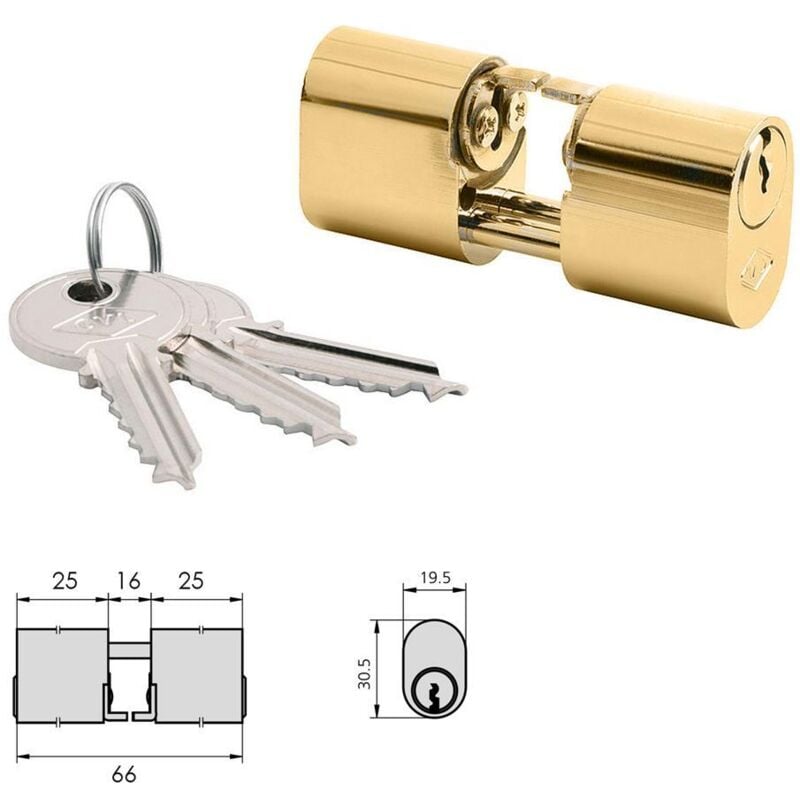 Cilindro CVL 5968/25x25/Ovale Camme e Aste Ottone Lucido Doppio Cilindro - Cilindro ovale - Corpo in ottone - Rotori in ottone - Con camme e aste - Doppio cilindro - 3 chiavi - Articolo noto anche come bombillo, bombetta.