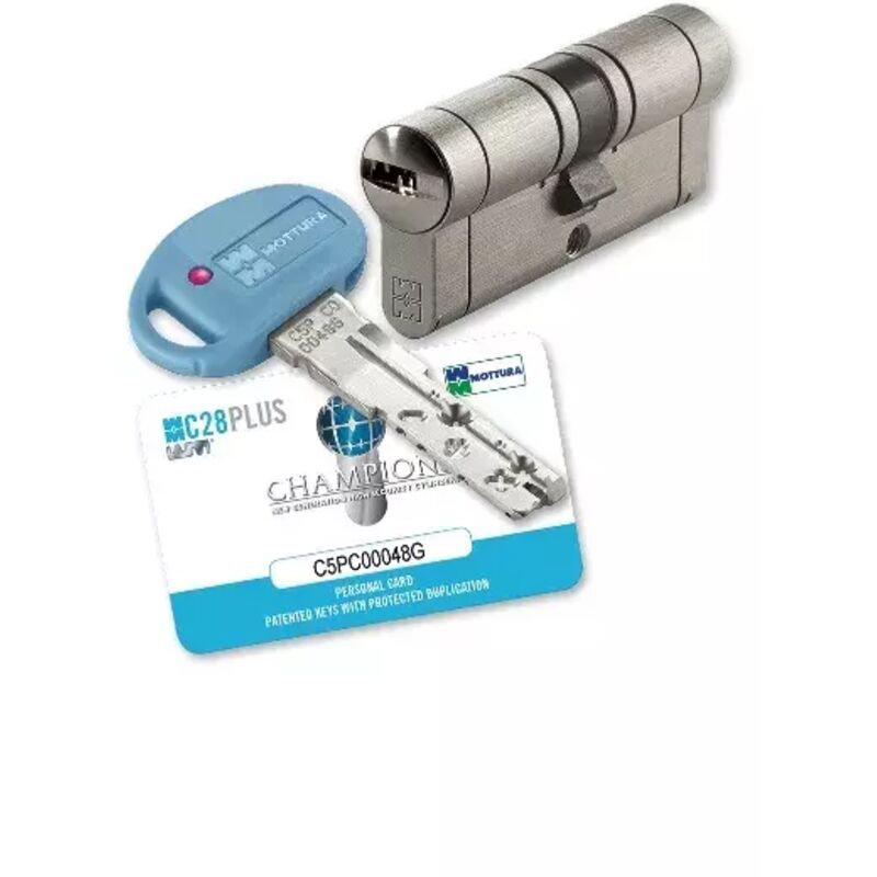 Cilindro di sicurezza modello C28 PLUS con chiave a DUPLICAZIONE PROTETTA. Corpo e rotore dotati di dispositivi di protezione contro la foratura(spine, perni e tappi di elevata durezza). Perni e contropistoni con sagomatura antigrimardello in acciaio temprato. Perni contollo profilo sagomati superiori e laterale in ASSE che in caso di picking o bumping bloccano in maniera irreversibile il cilindro, impedendone l'apertura. Corpo cilindro con intaglio per una rottura controllate in caso di effrazione. Chiave brevettata con elemento mobile a tre gradi di libertà che la protegge da riproduzioni non autorizzate. La confezione comprede: cilindro, carta di proprietà, 3 chiavi, istruzioni di montaggio e vite per il fissaggio. A garanzia della massima sicurezza le chiavi e le carte sono sigillate. La duplicazione può essere effettuata solamente dai centri autorizzati MOTTURA CLUB portando insieme alla chiave anche la tessera di proprità. Finitura: nichel satinato spazzolato.