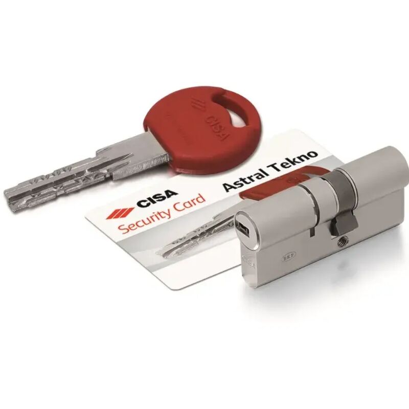 Profilo europeo, chiave piatta reversibile. Corpo in ottone a finitura nichelata. Funzionamento chiave interno ed esterno, 10 perni. Cilindretti ottone, camma frizionata in acciaio, perni in acciaio cementato, molle in bronzo fosforoso e acciaio. Dotazione: 3 chiavi, security card, vite fissaggio. Conforme alle normative EN 1303:15. Resistenza attacco grado C.