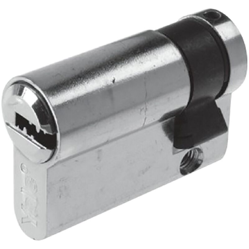 Profilo europeo, chiave piatta reversibile. Corpo in ottone a finitura nichelata opaca. Funzionamento chiave interno ed esterno, 6 perni. Spine anti trapano su corpo e barilotto, vite di fissaggio M5x70 inclusa. Dotazione cinque chiavi in ottone nichelato. Brevettato.. mm 25+10+5 = 40 (30+10). Prezzo inteso per: 1 PZ
