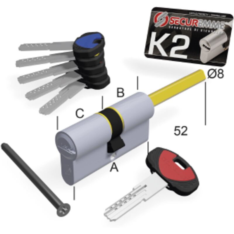 Securemme Cilindro K2 con predisposizione per pomolo Dimensioni 90 (30-60) Qualità Made in Securemme Cilindro K2 a profilo europeo,predisposto per il pomo, chiave piatta ottone nichelato reversibile a 10 spine. Spina antitrapano nel corpo cilindro. In dotazione: 1 chiave da cantiere, 5 chiavi padronali sigillate con cappuccio chiave, codecard, vite di fissaggio,dal centro del foro di fissaggio al perno di supporto del pomolo il cilindro è sempre 30mm, il perno di supporto del pomolo è lungo mm65 può essere tagliato