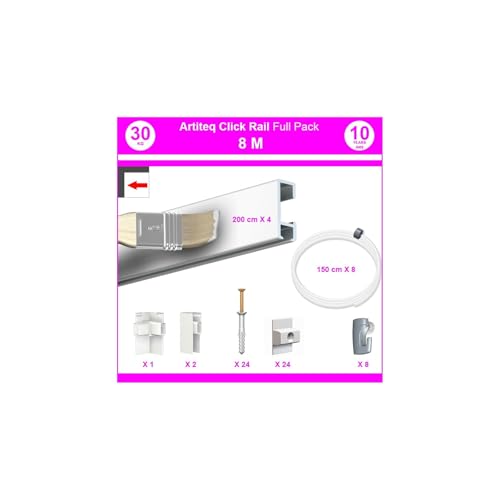 Le cimase con sistema a binario Click Rail di Artiteq sono eleganti. Questa confezione è composta da 8 metri di binari-cimase a scatto con supporti Click & Connect. Sono compresi anche i cavi perlon Slider (che si inseriscono da un lato) e i gancetti NEWLY H50. Le cimase a binario sono disponibili in bianco, bianco primario (può essere dipinto) e alluminio spazzolato. Altezza del binario: 25 mm, Profondità del binario: 8,5 mm.