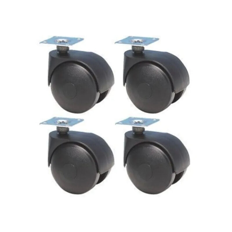 Set di 4 ruote TWINY D. 40 mm x H. 56 mm con piastra girevole CIME riferimento VS.529384 Castore TWINY Set di 4. Con una piastra fissa di 27x27 mm. Interasse 26x26 mm. Carico massimo: 40 kg. Altezza: 56 mm. Diametro: 40 mm. Telaio in polipropilene copolimero nero e ruota doppia.