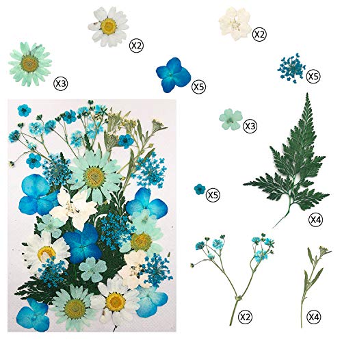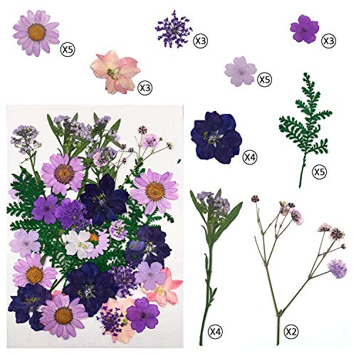 Set di fiori secchi abbinati: la confezione include 2 confezioni di fiori secchi in blu e viola e 1 confezione di foglie secche naturali, per un totale di 90 diversi pezzi di fiori e foglie e 1 pezzo di pinzette curve.
