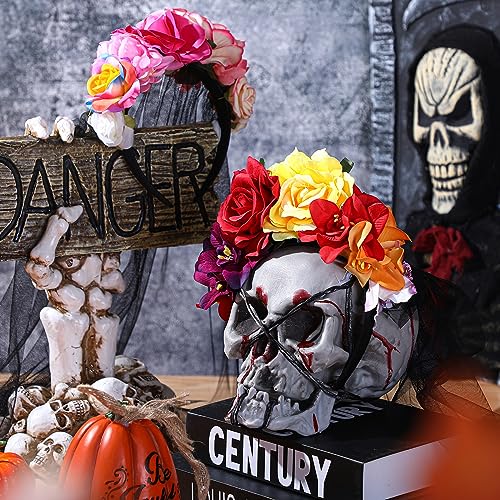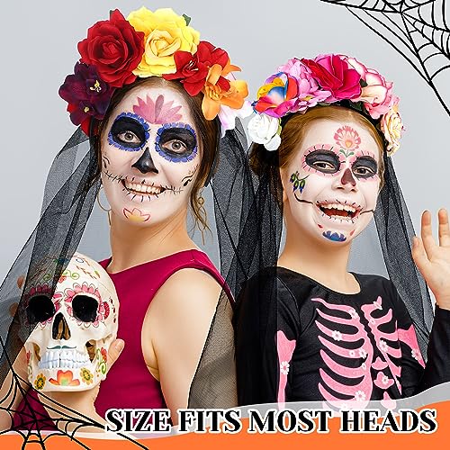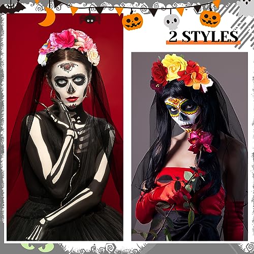 Cindeer 2 Pezzi Fascia con Velo per Giorno dei Morti Cerchietto di Halloween Fascia Messicana con Velo Corona di Fiori Messicana con Velo per Costume di Halloween per Donna (Tanti Colori)