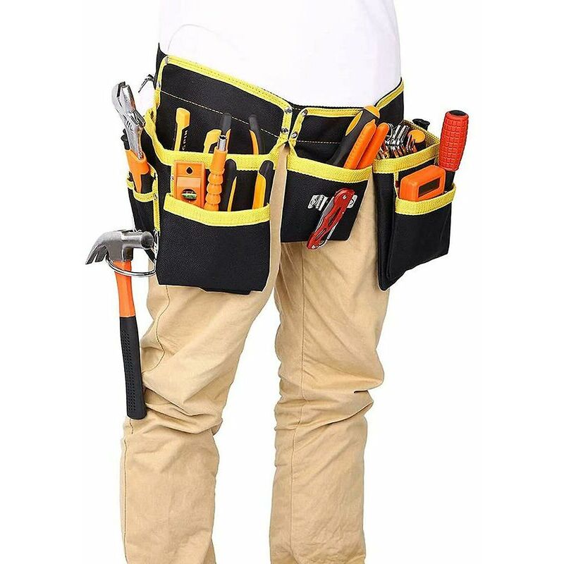 Cintura porta attrezzi con 11 tasche. Materiale: tela oxford di alta qualità, durevole e resistente. Cinghie regolabili: la nostra cintura porta attrezzi ha cinghie regolabili. Quindi puoi regolare le dimensioni in base alle tue esigenze. Poiché è regolabile, è adatto alla maggior parte delle persone. Dimensioni della cintura (L x A): 50 x 24 cm, con cinghie regolabili, per permetterti di regolare la taglia in base alle tue esigenze. Cintura portautensili multifunzionale: regalo per la festa del papà, regalo per uomo, regalo per padre e marito, ideale per elettricisti, carpentieri, commercianti, tecnici HVAC, meccanici, idraulici, muratori, giardinieri, per saldatori e altri. A casa o al lavoro. Cintura con tasche porta attrezzi. Design: aspetto semplice e strati durevoli. Colore principale: nero. Linee gialle impreziosiscono la cintura degli attrezzi per renderla elegante e bella.
