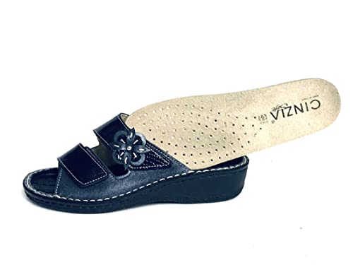 CINZIA SOFT, Pantofola Ciabatte Donna Linea Ortopedica in Pelle Blu, Chiusura Strap, Plantare Estraibile, Zeppa Bassa, 2812