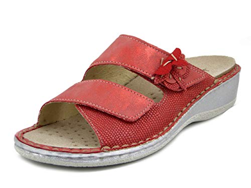 CINZIA SOFT, Sandali Donna Ciabatta Comfort Linea Ortopedica in Pelle Rosso, Doppio Strap, Plantare Estraibile, Zeppa Bassa