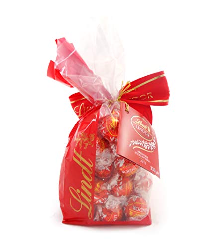 Praline Lindor di Lindt al cioccolato al latte. Sacchetto regalo da 330 gr, chiuso con elegante fiocco rosso.