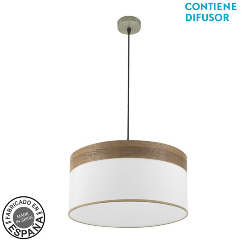 Pendente di design della serie CLOE in colore CUOIO con schermo BIANCO/LEGNO SCURO. Realizzato in metallo e tessuto. Con uno stile moderno, presenta un contrasto di colori sul suo paralume, essendo molto originale e decorativo per illuminare camere da letto, sale da pranzo, soggiorni e aree di lavoro, creando un'atmosfera diversa. Ha due portalampada E27. Lampadina non inclusa. Il suo paralume ha un diametro di 50 centimetri, con altezza regolabile, la sospensione ha dimensioni di 47