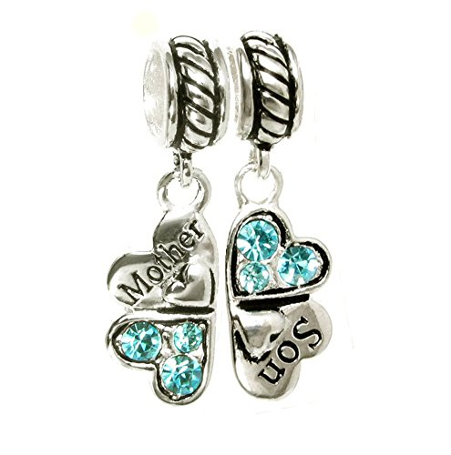 Ciondolo a forma di trifoglio composto da due cuori con scritta "Mother" (Mamma) [lingua inglese] e "Son" (Figlio) [lingua inglese], in argento sterling, per braccialetti con charm Pandora