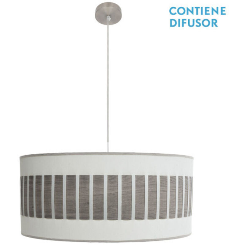Pendente anni 80serie IVANNA colore NICKELcolore con schermo BIANCO/GRIGIO LEGNO. Ha tre preseper E27. Lampadine non incluse. Spicca il suo originale paralume cilindrico con inserti e nastro passante nei colori del legno, risultando in un accostamento molto moderno ed elegante, ideale per arredare e illuminare ingressi, salotti, uffici e soggiorni. Molto adatto sia per decorazioni rustiche che moderne o vintage. Ha dimensioni regolabili in altezza di 46