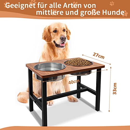 Ciotola rialzata per cani. La ciotola rialzata completa per cani è composta da un tavolo largo 33 cm, un tavolo alto 27 cm e due ciotole per cani in acciaio inox con un diametro di 10 cm. Rende più facile il vostro cane mangiare comodamente.