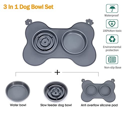 Pet Ciotole per Cani Gatti, Pet Ciotole Doppia, Tappetino Silicone Antiscivolo, Ciotole per Animali e Water Bowl, Alimentazione Lenta, Divertente Ciotola Interattiva per Gatto e Cane(Grigio)