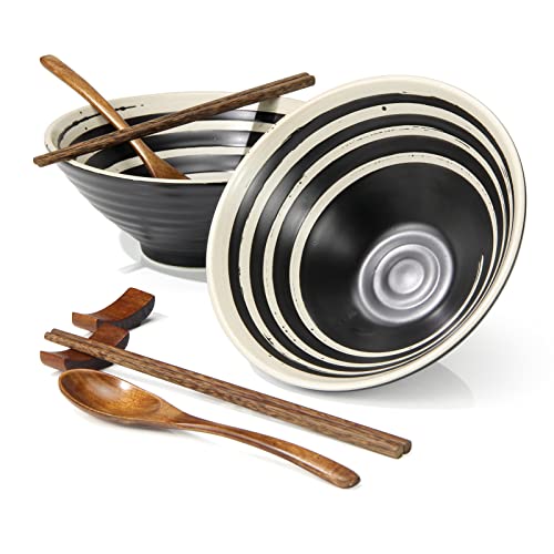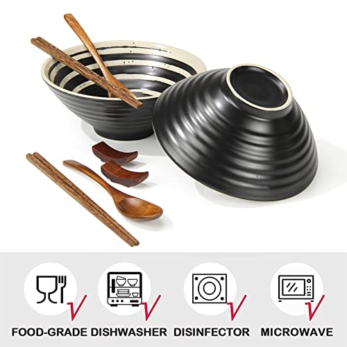 Ciotole in ceramica giapponese, 2 set da 1000 ml, regalo creativo, retrò, con bacchette e cucchiai, adatte al microonde, per insalata di frutta, verdura, noccioli (nero)