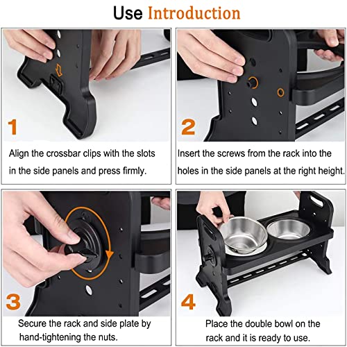 Ciotole rialzate per cani con supporto inclinato: questo set di ciotole rialzate è composto da 2 ciotole per animali domestici in acciaio inossidabile da 400 ml, ognuna del peso di 425 g. Il supporto è realizzato in ABS. Le ciotole in acciaio inossidabile sono resistenti alla ruggine e durevoli. La doppia ciotola è adatta sia per l'alimentazione che per bere. Inoltre comode maniglie per spostare i supporti della ciotola.