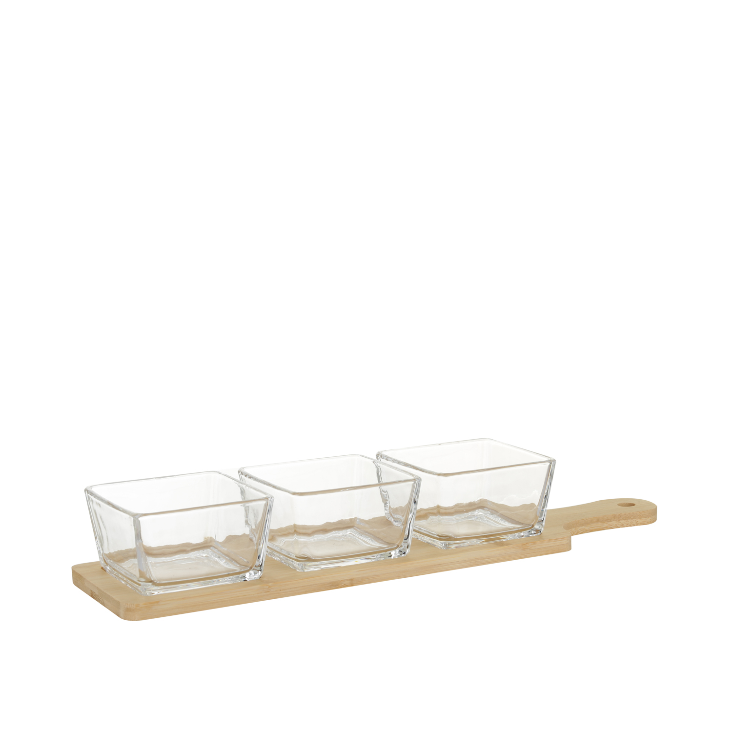Il set aperitivo Verre è la scelta perfetta per chi desidera unire eleganza e praticità durante gli aperitivi. Composto da un raffinato vassoio in bambù e tre ciotole quadrate in vetro, questo set si distingue per il suo design moderno e versatile. Il vassoio in bambù offre una base robusta e naturale per il trasporto ed aggiunge anche un tocco di calore e naturalezza alla presentazione. Le ciotole in vetro, con la loro forma quadrata e linee pulite, sono ideali per servire una varietà di antipasti, salse e snack, permettendo di vedere chiaramente il contenuto grazie alla loro trasparenza.