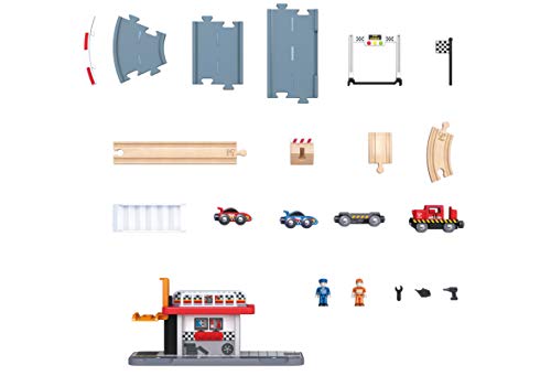 UN CIRCUITO DA CORSA COMPLETO: il set include una pista costituita da 8 binari stradali curvi e 5 rettilinei, una stazione di servizio con strumenti di manutenzione e 2 auto da corsa. In più, 5 binari ferroviari in legno compatibili con altri set, un treno a due carrozze e due personaggi per favorire il gioco di ruolo.