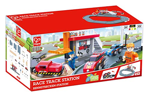 Circuito da corsa con stazione di servizio Hape in bioplastica 3+| Include binari stradali e ferroviari, automobiline e personaggi