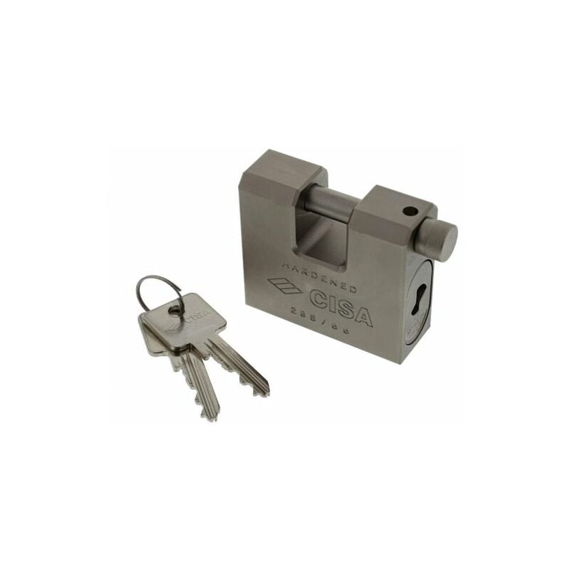 Corpo monoblocco in acciaio resistente alla corrosione, arco in acciaio cementato. Con 2 chiavi. Larghezza 75 mm