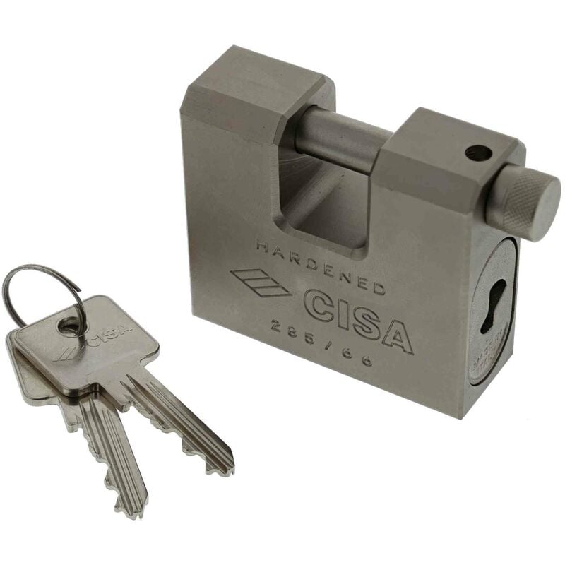 1,0 PZ Di CISA 28550 LUCCHETTO CORAZZATO MONOBL ANTIC 84 MM corpo monoblocco in acciaio resistente alla corrosione, arco in acciaio cementato. Con 2 chiavi. Larghezza 84 mm