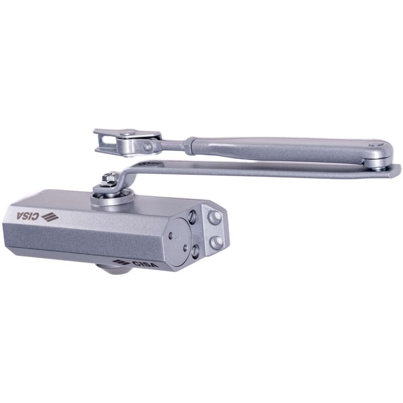 Serie 604.60.97 corpo in lega di allumino, braccetto in acciaio. Forza di chiusura regolabile da EN 2 a 4 variando la posizione di montaggio. Valvola di regolazione della velocit di chiusura e del colpo finale senza arresto. Speciale molla in acciaio a bagno dolio. Per porte destre o sinistre a tirare o a spingere. Per porte fino a 100 cm. Portata fino a 85 kg. Ambidestra, a tirare o a spingere. Colore argento. Peso 2,500 kg.