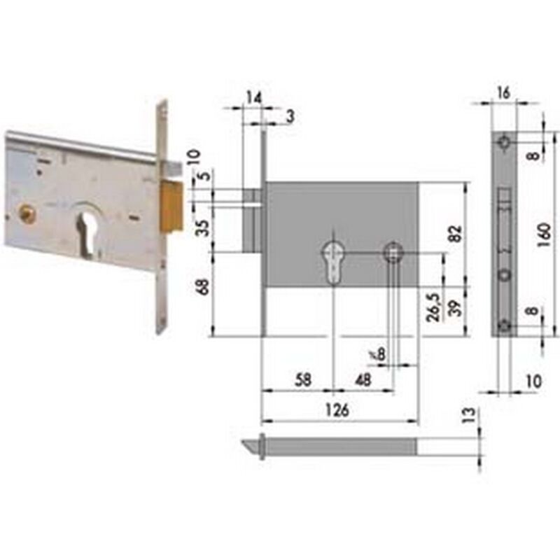 Scatola e frontale in acciaio con rivestimento in zinco, catenaccio e scrocco autobloccante incorporato in ottone, scrocco autobloccante, fermo a giorno, con quadro maniglia da mm.8 passante, funzionante con cilindro sagomato non compreso, tensione 12v ac
