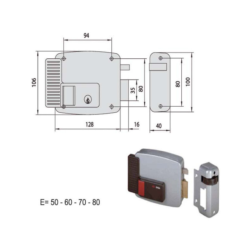 Elettroserratura V 12 porte legno applicare Zincata - Scrocco autobloccante Bocchette metallo - Pulsante interno Cilindro OG200.55.0 Misure mm 128x106