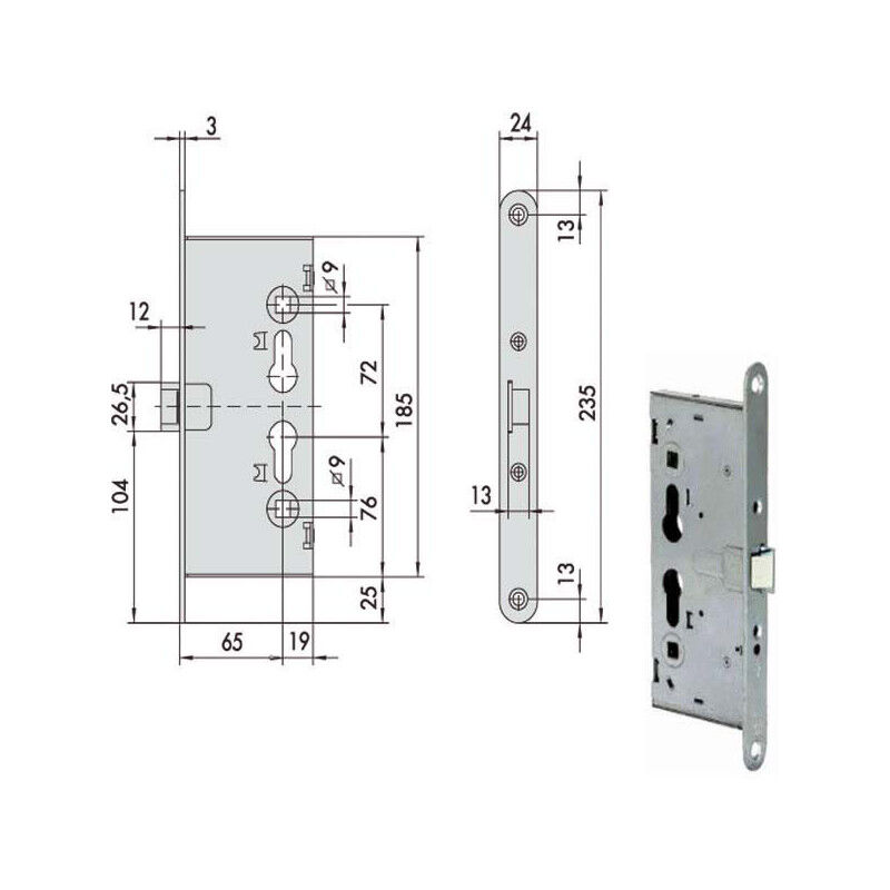 Elettroserratura V12 porte tagliafuoco infilare Zincata - Scrocco Q9 - Ambidestra Scatola 84x185 Frontale mm 24x235 - Entrata mm 65 Cilindro non incluso Abbinabile maniglioni antipanico Cisa 59600/59711