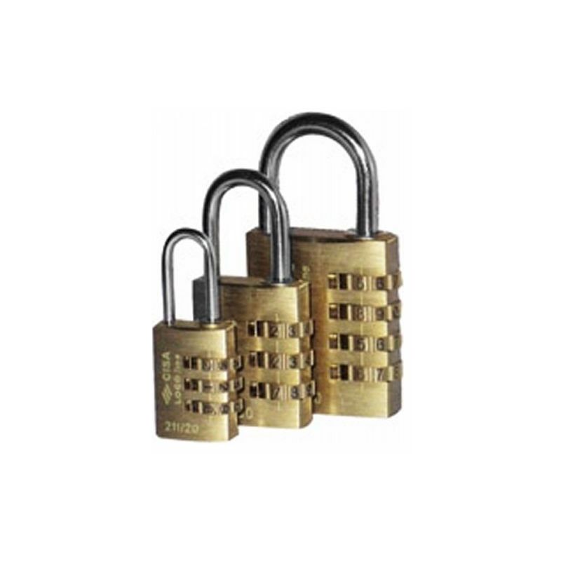 Lucchetto -cisa/locking line 21190- combinatore corpo monoblocco in ottone, arco in acciaio. tre dischi per 1000 combinazioni per dimensioni 20 e 30 mm, quattro dischi per 10.000 combinazioni per dimensione da 40 mm. confezione in cartone piu' termoretraibile.