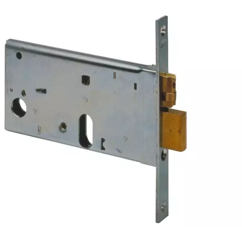 Serratura da infilare a cilindro ovale per fasce, altezza scatola 77 mm. Scatola e frontale in acciaio con rivestimento in zinco, catenaccio e rullo regolabile, frontale mm.16, entrata disponibile mm.70.