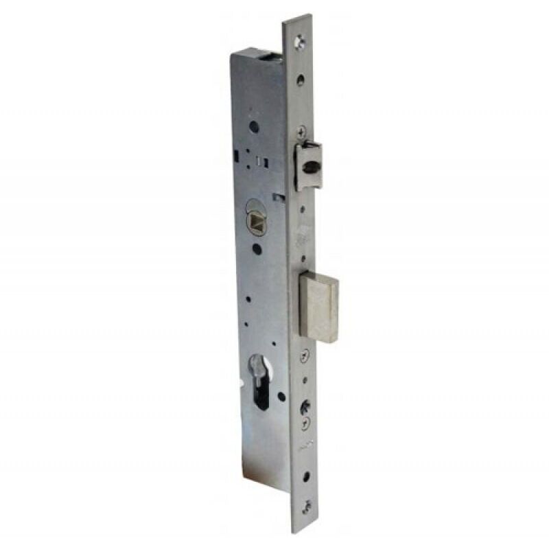 Per montanti - Zincata - Dispositivo di azionamento tramite sistema a ingranaggi - Sistema antisvasatura brevettato - Scrocco e catenaccio a scorrimento orizzontale - 2 mandate Misura 35 mm. Frontale 22 mm.