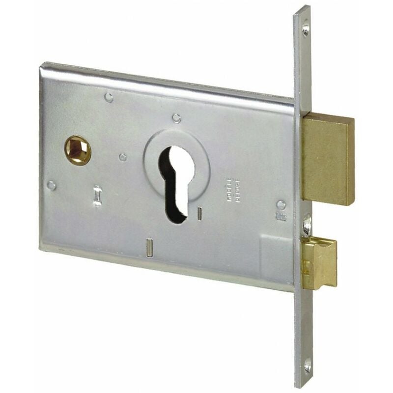 Serratura da infilare per fasce. 2 mandate e scrocco, zincata, scatola mm. 126x82. Art. 44121 cod. 16433 E. mm. 60 - F. mm. 20 cf/pz 1