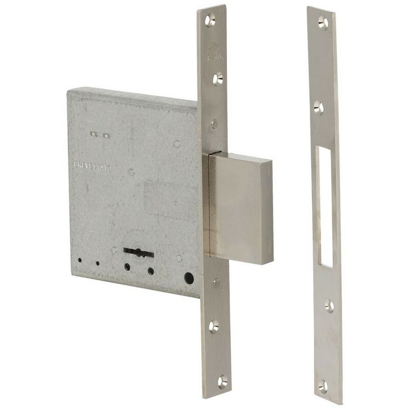 Scatola in acciaio con rivestimento in zinco, frontale e contropiastra in acciaio satinato nichelato. catenaccio acciaio nichelato. a 4 mandate, frontale 25 mm. dotazione viti fissaggio, 3 chiavi, contropiastra, copritoppa.e 70