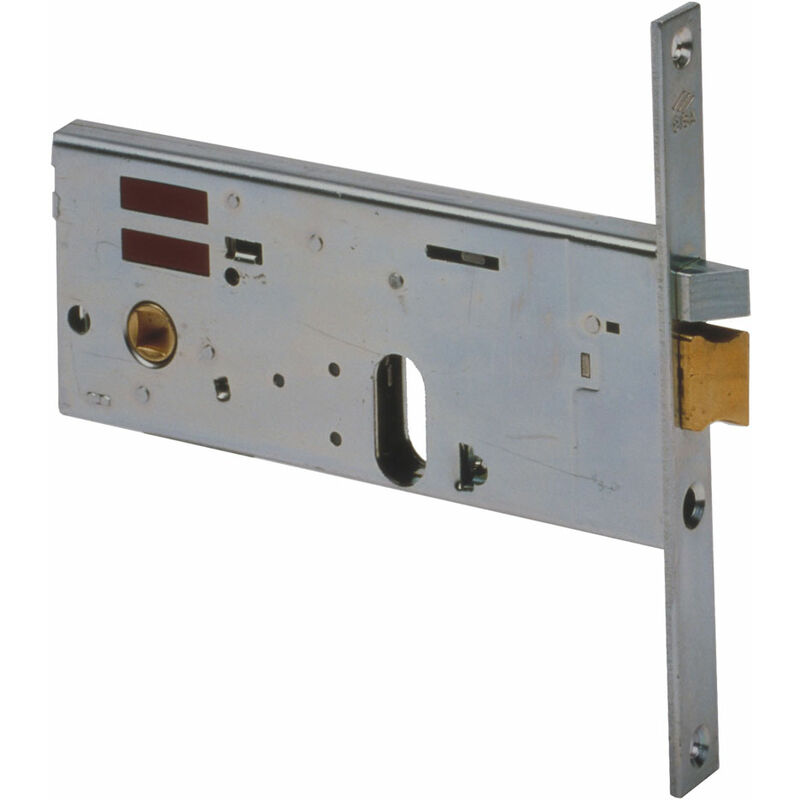 Foro cilindro europeo ovale. Con scrocco autobloccante. Scatola e frontale zincato. Scrocco in ottone, altezza scatola 64 mm. Tensione 12V, quadro maniglia mm 8. Dotazione vite di fissaggio cilindro. Senza cilindro.