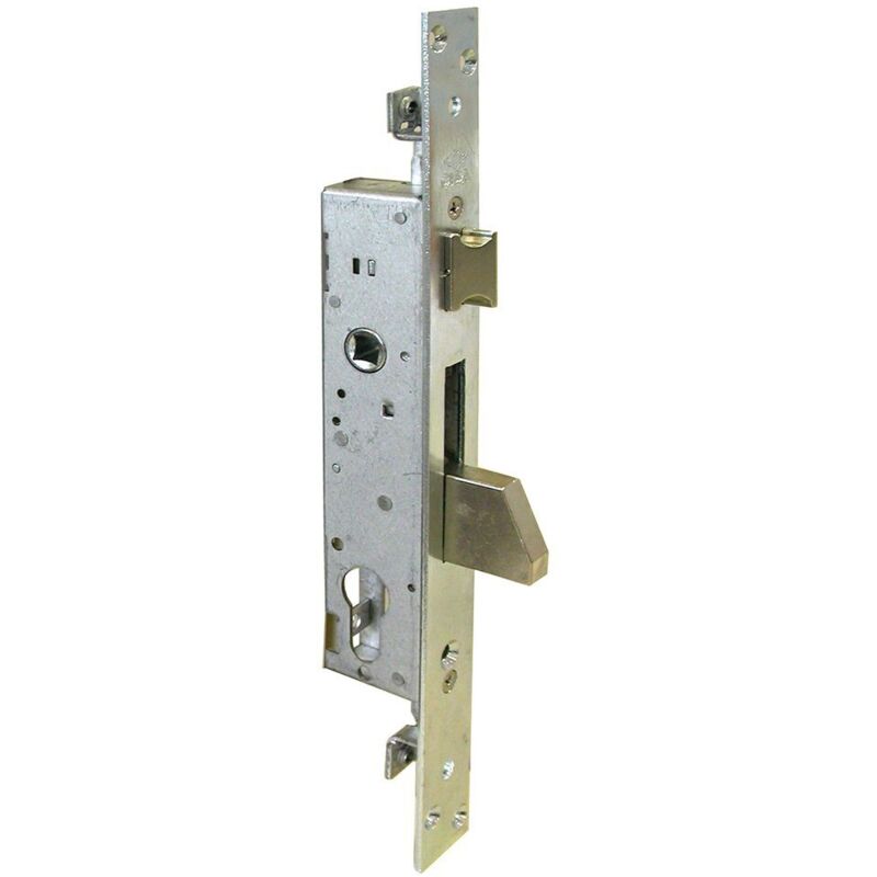 Serratura da infilare. In acciaio, 1 mandata, scrocco, quadro maniglia, 2 boccole filettate (M8), borchia, predisposizione per chiusure supplementari, scatole mm. 45/50x172.
