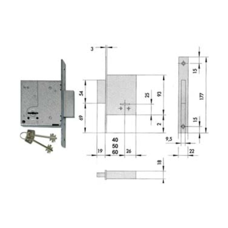 Mm.45 piastra mm.22x175h. (57223450) per porta in ferro, scatola e frontale in acciaio con rivestimento in zinco, catenaccio in acciaio nichelato, 2 mandate, dotazione borchia interna in acciaio e 2 chiavi Categoria merceologica: Serrature, chiusure di sicurezza e accessori - Sicurezza - Serrature a doppia mappa da infilare