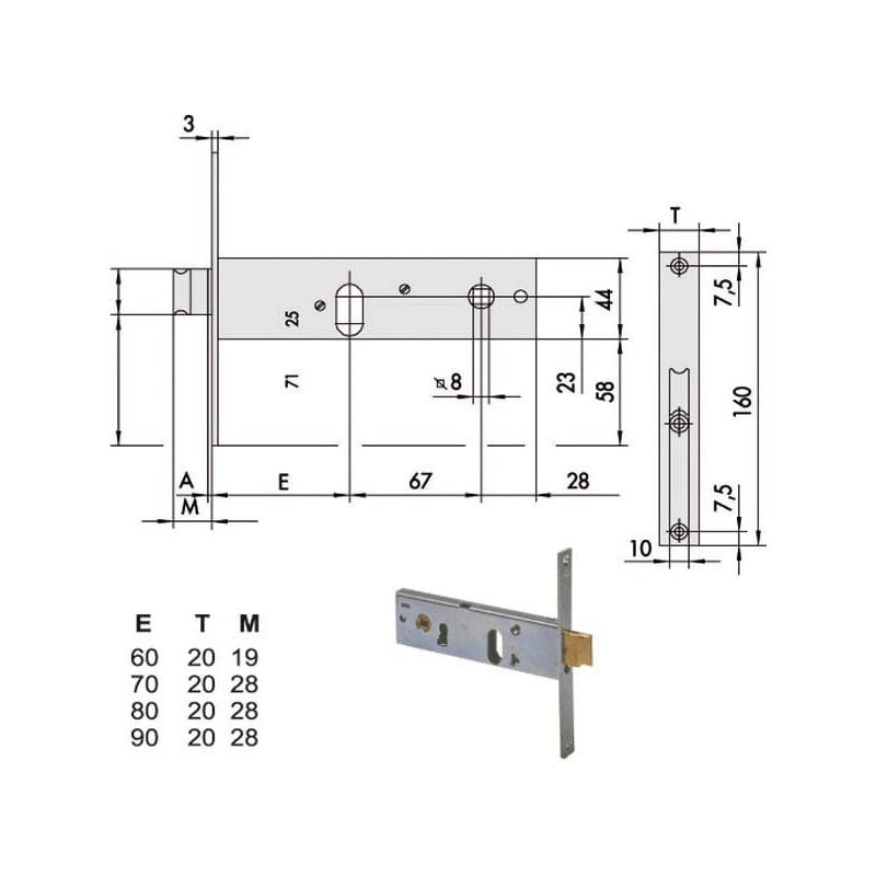 Serratura fasce alluminio infilare Scrocco catenaccio incorporato reversibile Zincata - Ambidestra Cilindro non incluso Scatola 44 - Frontale 20x160