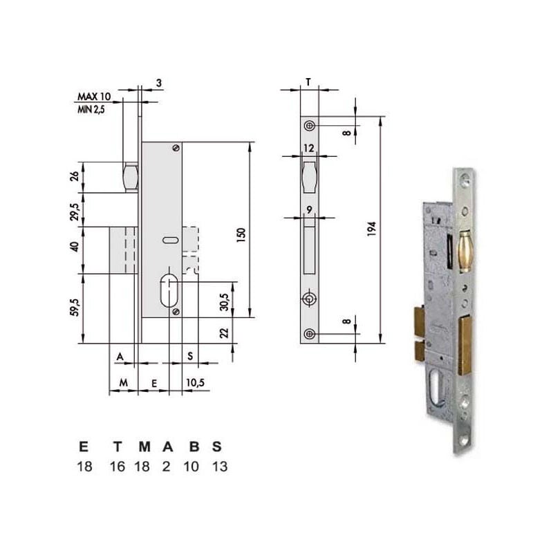 Serratura montanti alluminio infilare Zincata - Catenaccio - Rullo regolabile 2 mandate ambidestra Cilindro non incluso Scatola 150 - Frontale 16x194