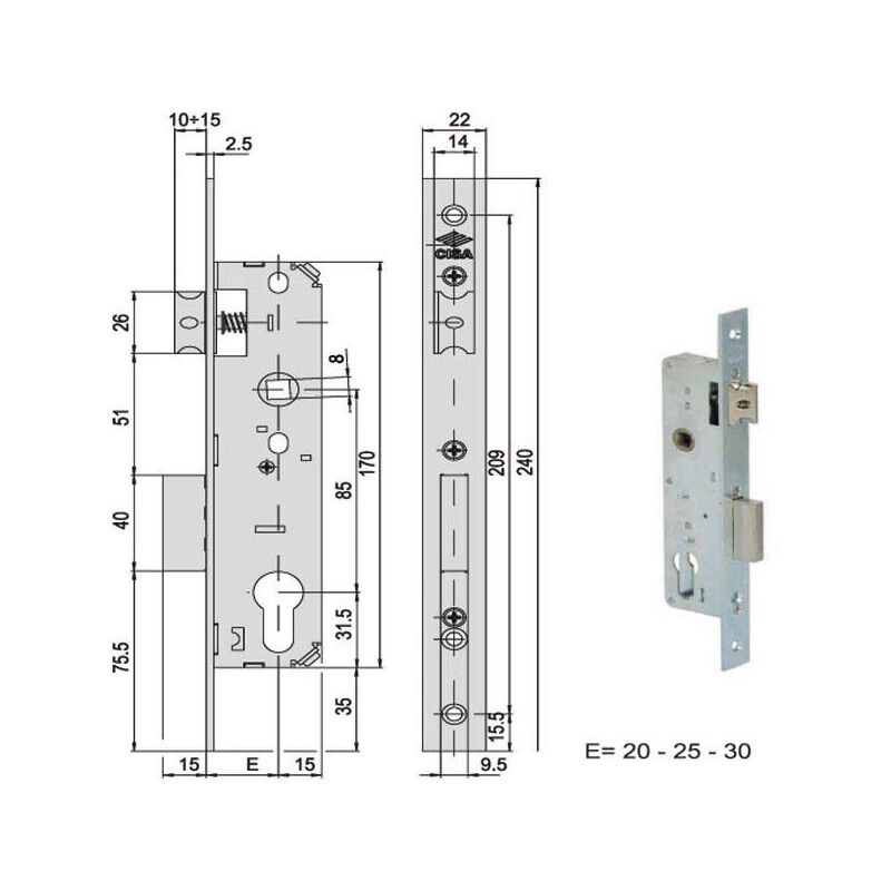 Serratura montanti alluminio infilare Zincata - Catenaccio - Scrocco regolabile Ambidestra Cilindro non incluso Scatola 170 - Frontale 22x240