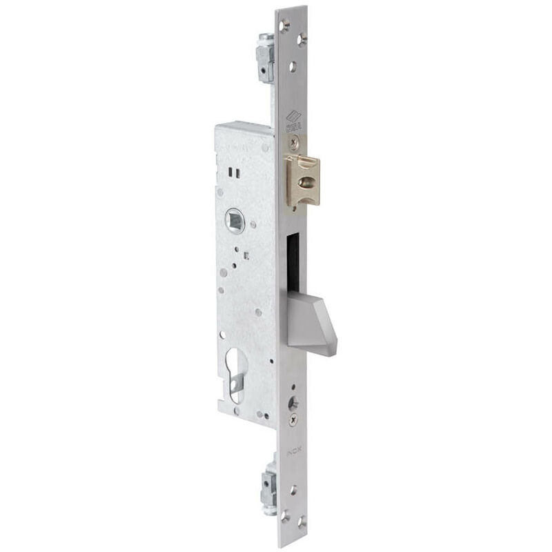 Foro cilindro europeo. Catenaccio e scrocco nichelati. Scrocco reversibile e regolabile da 11 a 17 mm. Interasse 85 mm, frontale 25 mm. Predisposizione per chiusure supplementari con boccole filettate M8. Dotazione vite di fissaggio cilindro. Senza cilindro.