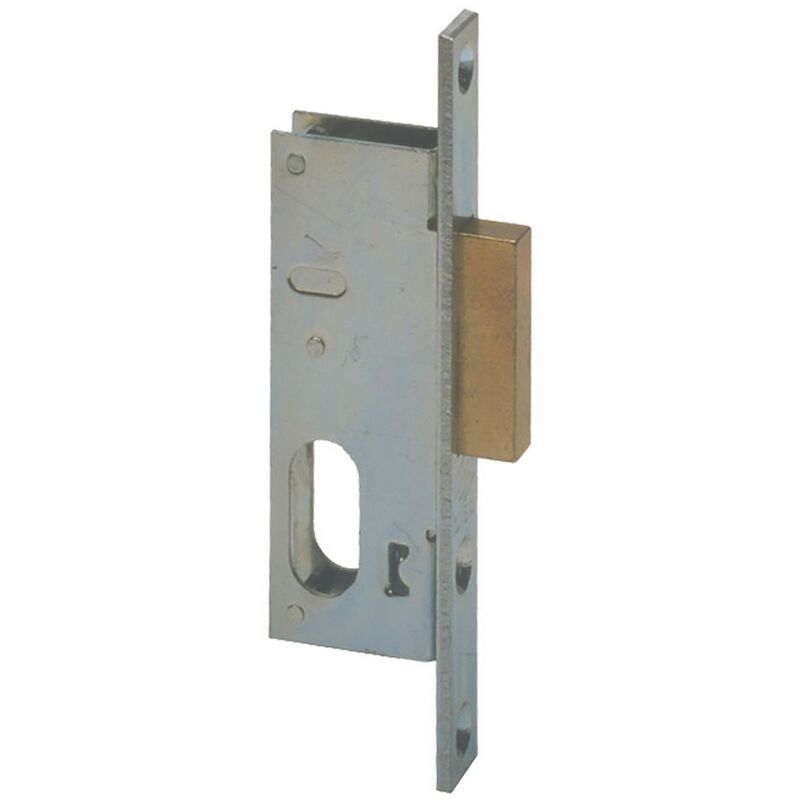 Foro cilindro europeo ovale. con catenaccio in ottone. scatola e frontale zincato. a 1 mandata. frontale 16 mm. dotazione vite di fissaggio cilindro. senza cilindro.e15