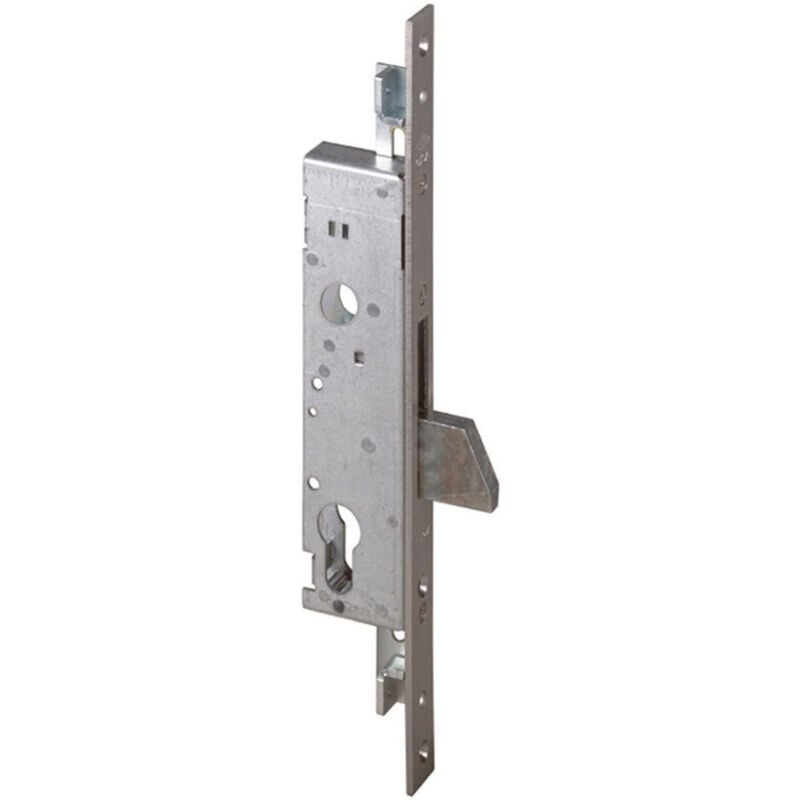 Scatola in acciaio con rivestimento in zinco. foro cilindro europeo. catenaccio basculante nichelato, 1 mandata. frontale 22 mm acciaio inox. predisposizione per chiusure supplementari. dotazione vite fissaggio cilindro, borchie, perni filettati fissaggio