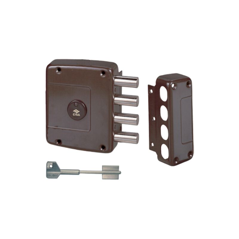 A doppia mappa. Chiusura con catenaccio a 4 pistoni e 4 mandate. Canotto guida chiave esterno. Scatola Mm. 123x150. Bocchetta Mm. 55x144. In acciaio verniciato bronzo antico metallizzato. In dotazione: 1 bocchetta, 1 borchia esterna, 3 chiavi e viti di fissaggio.