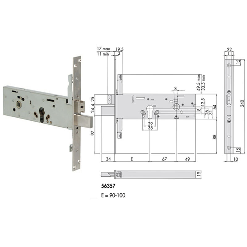 Serrature da infilare a cilindro 3 mandate per fascia h= 64 mm, reversibile, entrata 90 mm, interasse 67 mm, Frontale 22 mm.