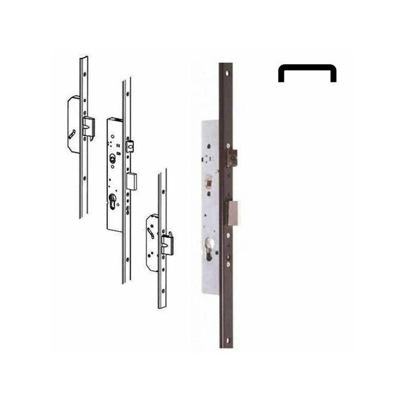 Serratura infilare interasse mm 85 Frontale U mm 24x2300 riducibile mm 150+350 3 catenacci di chiusura Scrocco reversibile e regolabile mm 11/17 quadro 8 Trasmissione ad ingranaggi - Entrata mm 25-30-35 Foro cilindro Cilindro non incluso Altezza scatola 247 Adatta per portoncini ingresso e porte balcone